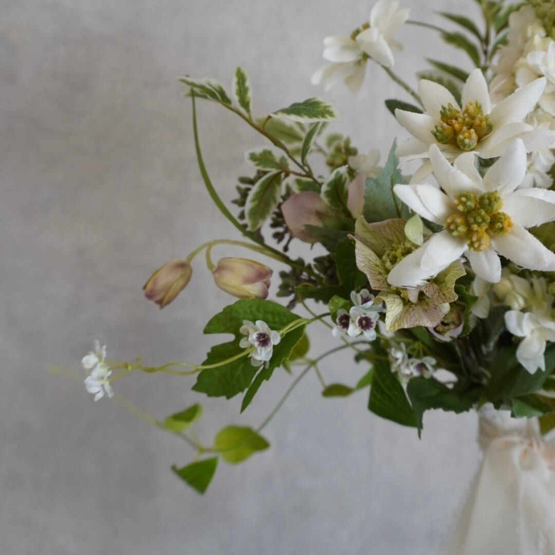 グリーンと華奢なホワイトのお花が可憐に揺れ動く、ナチュラルなデザイン。