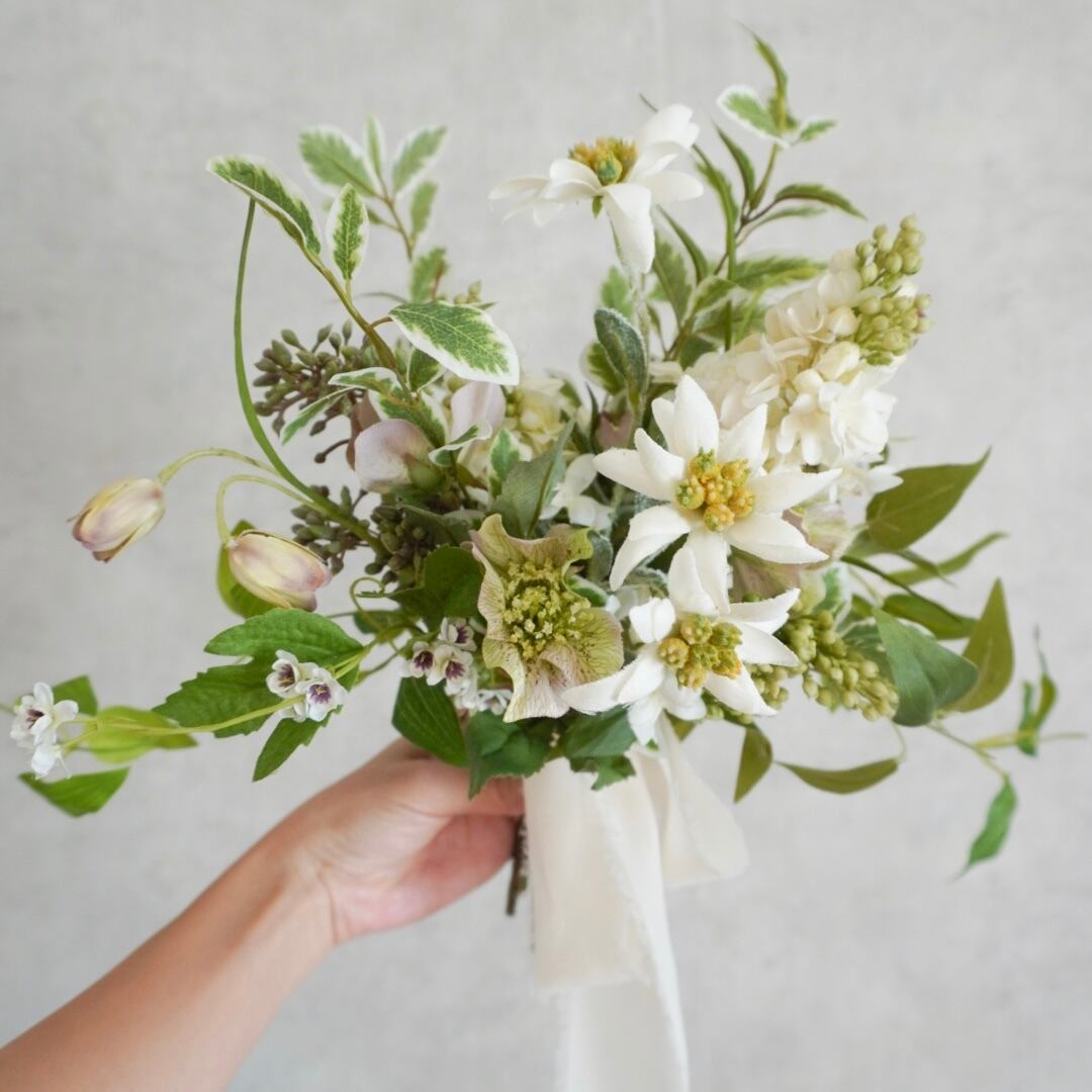 シンプルに、洗練された雰囲気を表現したい花嫁様に、ぜひお持ちいただきたいブーケです。