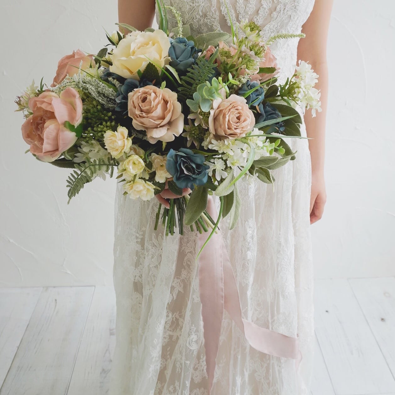 アンティークカラーのピンクやブルー・ホワイトのお花を使った