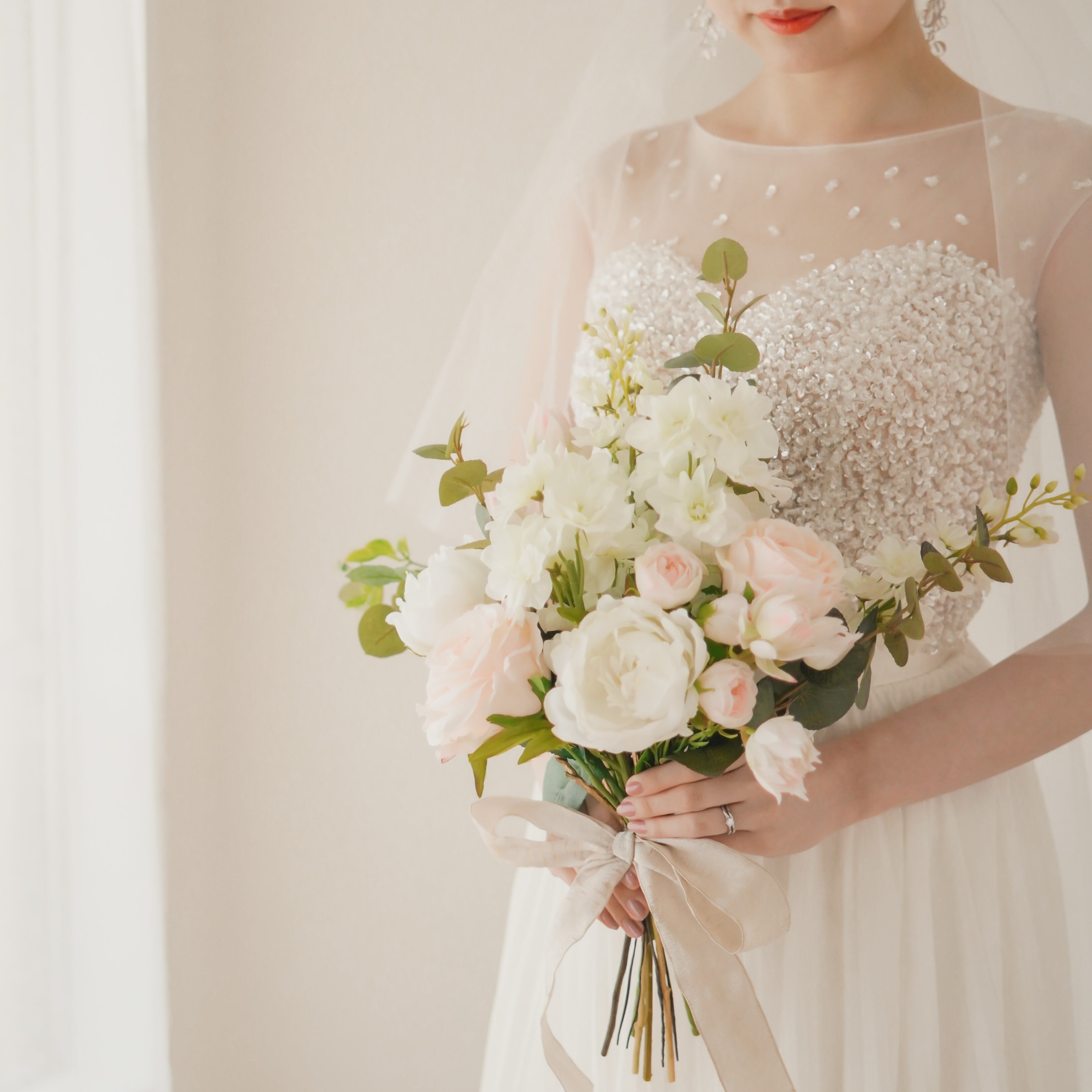ホワイト×淡いピンクのバランスが、可愛らしい花嫁様を引き立たせてくれる繊細なブーケ。